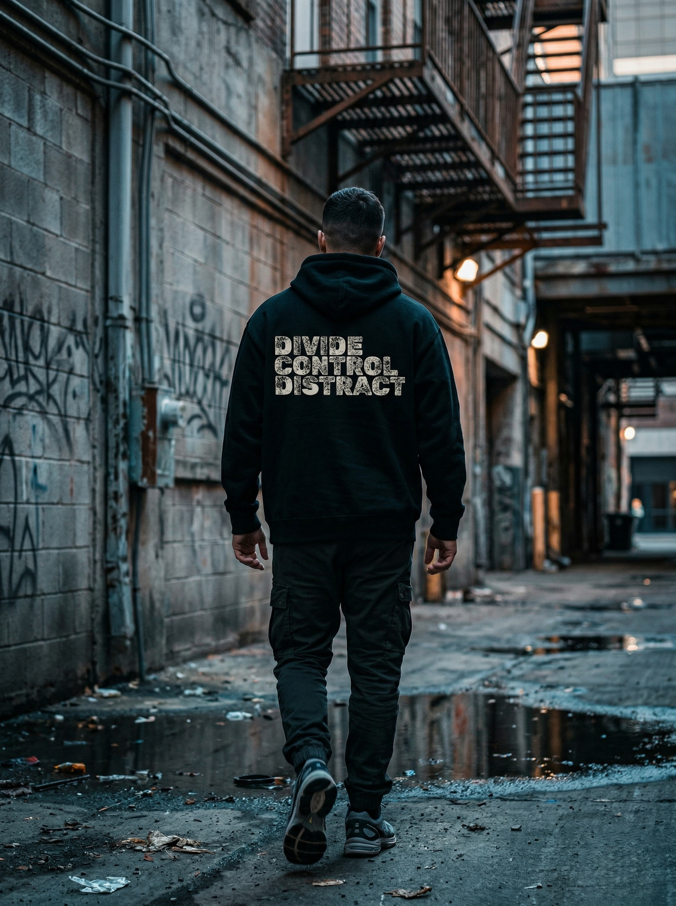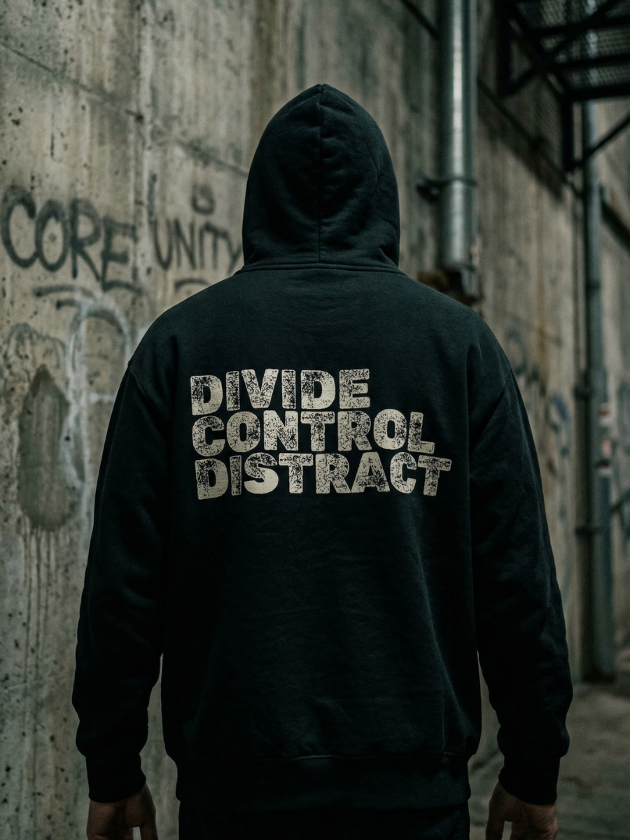 De DIVIDE CONTROL DISTRACT hoodie is een statement piece voor iedereen die ziet hoe het spel gespeeld wordt. Minimalistische streetwear met een rauwe, protest-achtige typografieprint op de rug en subtiele [REDACTED] branding op de borst.